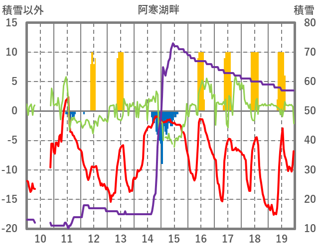 | 日 | 時 | 気温 | 降水 | 風向/風速 | 日照 | 積雪 | 降雪 |