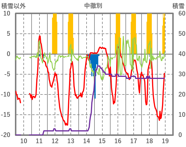 | 日 | 時 | 気温 | 降水 | 風向/風速 | 日照 | 積雪 | 降雪 |