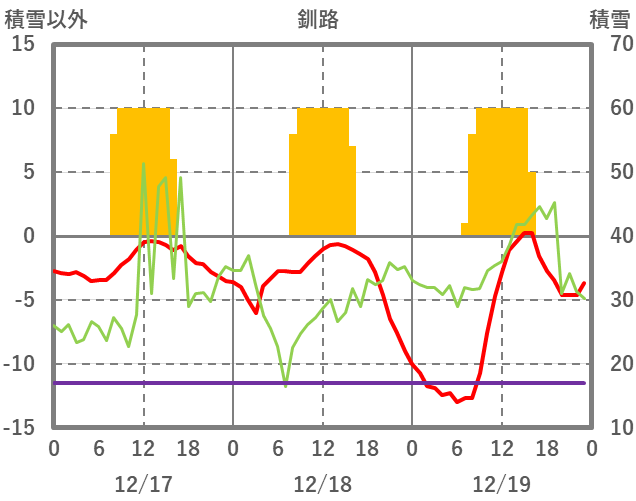 | 日 | 時 | 気温 | 降水 | 風向/風速 | 日照 | 積雪 | 降雪 |