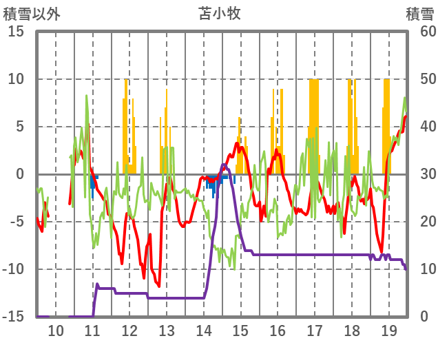 | 日 | 時 | 気温 | 降水 | 風向/風速 | 日照 | 積雪 | 降雪 |