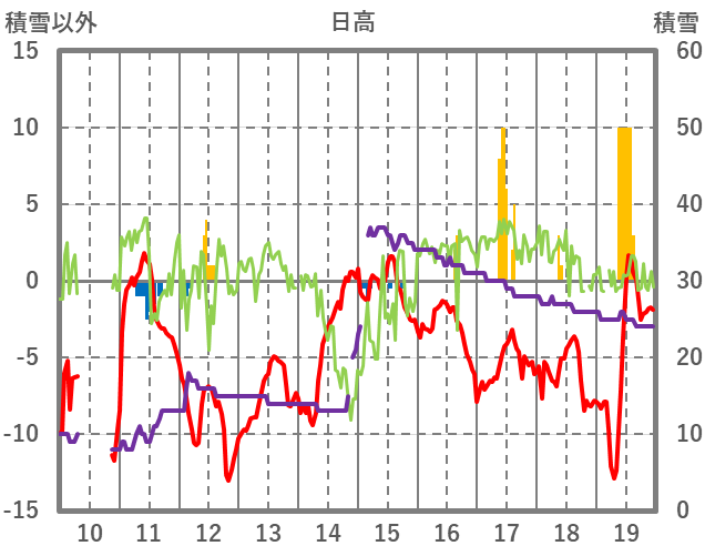 | 日 | 時 | 気温 | 降水 | 風向/風速 | 日照 | 積雪 | 降雪 |