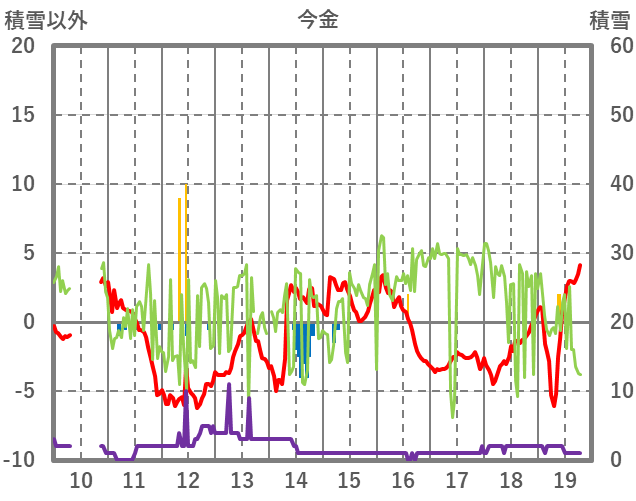 | 日 | 時 | 気温 | 降水 | 風向/風速 | 日照 | 積雪 | 降雪 |
