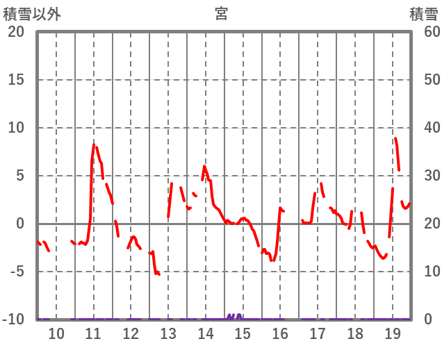 | 日 | 時 | 気温 | 降水 | 風向/風速 | 日照 | 積雪 | 降雪 |