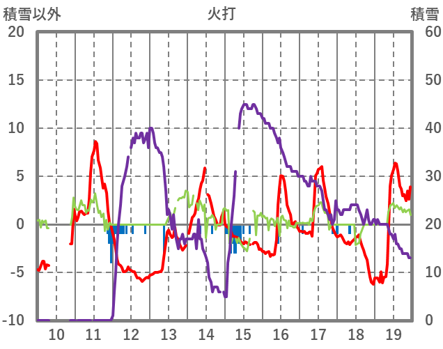 | 日 | 時 | 気温 | 降水 | 風向/風速 | 日照 | 積雪 | 降雪 |