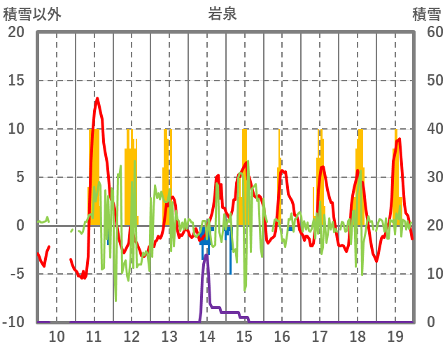 | 日 | 時 | 気温 | 降水 | 風向/風速 | 日照 | 積雪 | 降雪 |