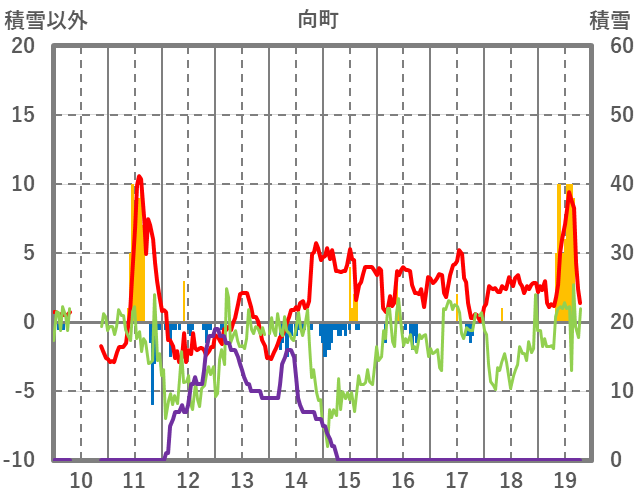 | 日 | 時 | 気温 | 降水 | 風向/風速 | 日照 | 積雪 | 降雪 |