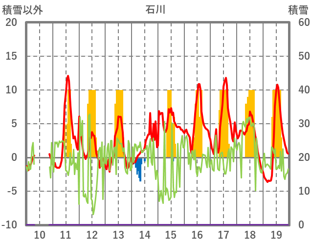| 日 | 時 | 気温 | 降水 | 風向/風速 | 日照 | 積雪 | 降雪 |