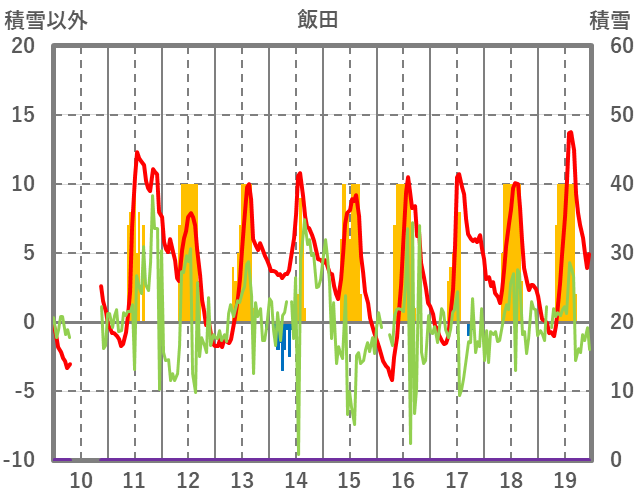| 日 | 時 | 気温 | 降水 | 風向/風速 | 日照 | 積雪 | 降雪 |