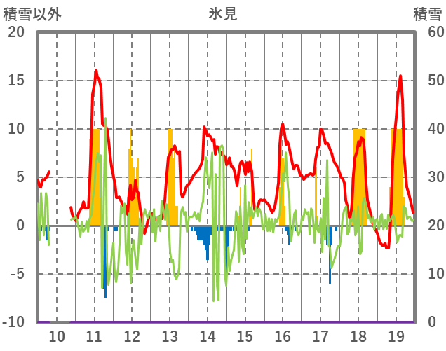 | 日 | 時 | 気温 | 降水 | 風向/風速 | 日照 | 積雪 | 降雪 |
