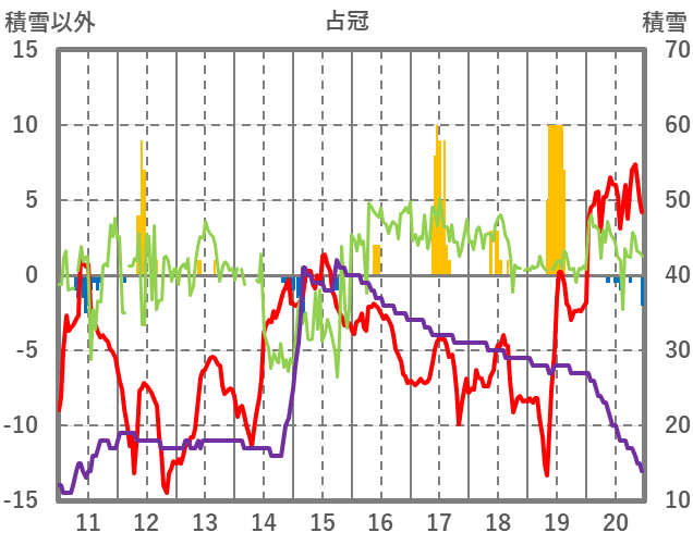 | 日 | 時 | 気温 | 降水 | 風向/風速 | 日照 | 積雪 | 降雪 |