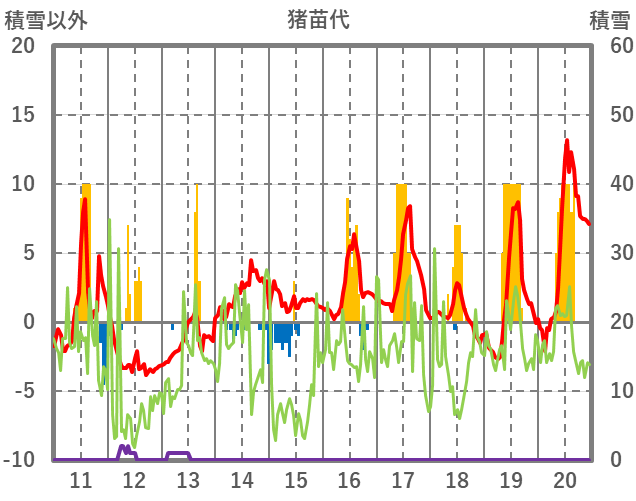 | 日 | 時 | 気温 | 降水 | 風向/風速 | 日照 | 積雪 | 降雪 |