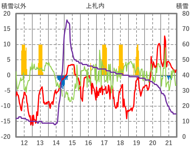 | 日 | 時 | 気温 | 降水 | 風向/風速 | 日照 | 積雪 | 降雪 |