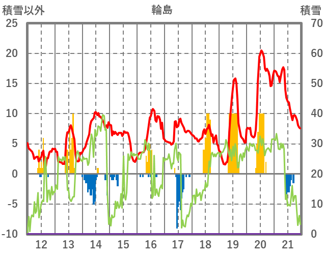 | 日 | 時 | 気温 | 降水 | 風向/風速 | 日照 | 積雪 | 降雪 |