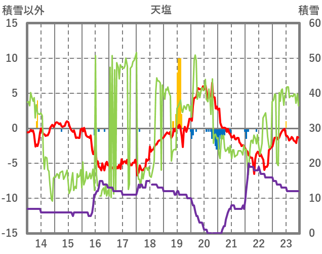 | 日 | 時 | 気温 | 降水 | 風向/風速 | 日照 | 積雪 | 降雪 |