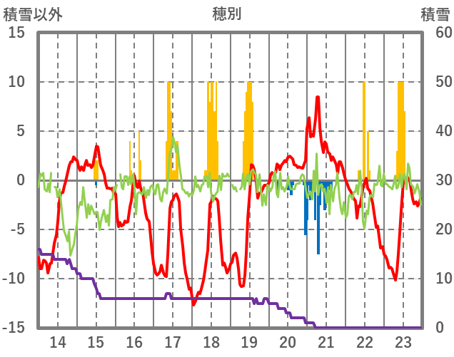| 日 | 時 | 気温 | 降水 | 風向/風速 | 日照 | 積雪 | 降雪 |