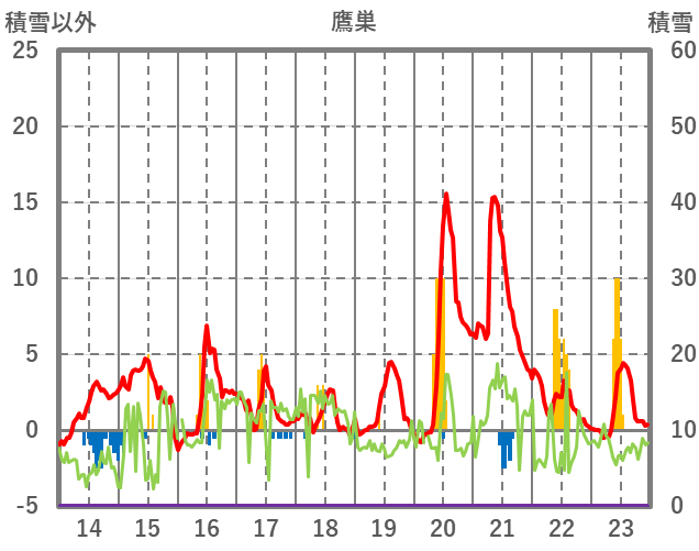 | 日 | 時 | 気温 | 降水 | 風向/風速 | 日照 | 積雪 | 降雪 |