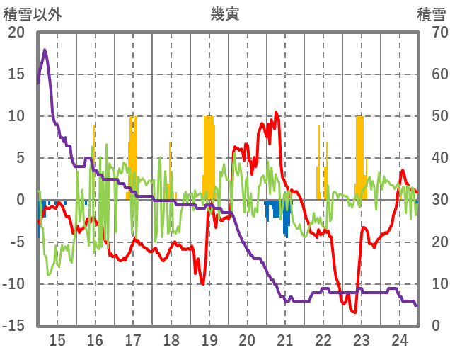 | 日 | 時 | 気温 | 降水 | 風向/風速 | 日照 | 積雪 | 降雪 |
