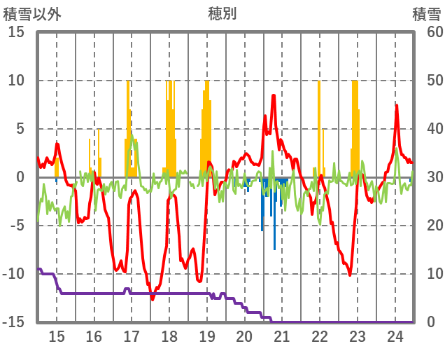 | 日 | 時 | 気温 | 降水 | 風向/風速 | 日照 | 積雪 | 降雪 |