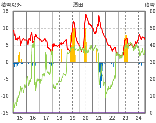 | 日 | 時 | 気温 | 降水 | 風向/風速 | 日照 | 積雪 | 降雪 |
