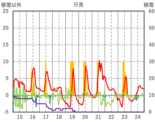 | 日 | 時 | 気温 | 降水 | 風向/風速 | 日照 | 積雪 | 降雪 |