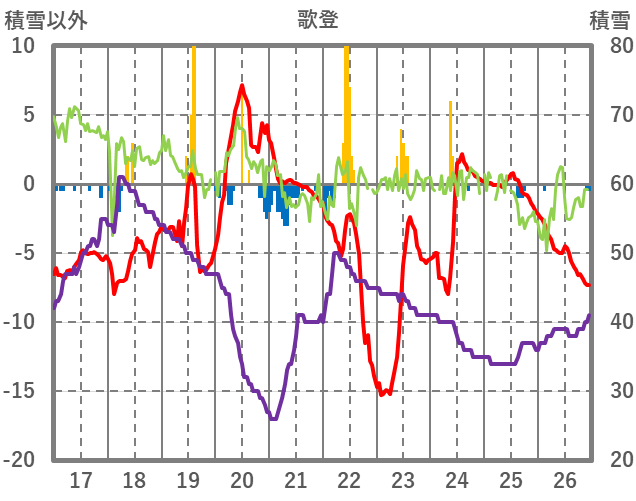 | 日 | 時 | 気温 | 降水 | 風向/風速 | 日照 | 積雪 | 降雪 |