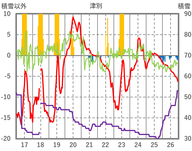 | 日 | 時 | 気温 | 降水 | 風向/風速 | 日照 | 積雪 | 降雪 |