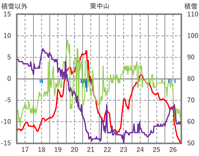 | 日 | 時 | 気温 | 降水 | 風向/風速 | 日照 | 積雪 | 降雪 |