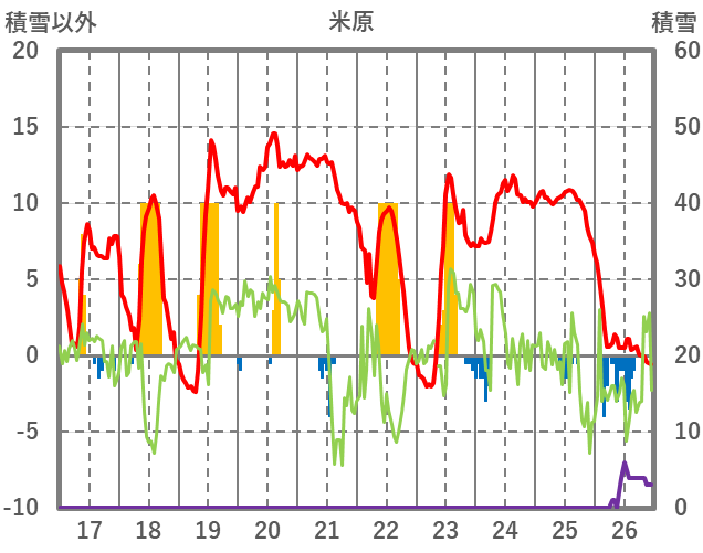| 日 | 時 | 気温 | 降水 | 風向/風速 | 日照 | 積雪 | 降雪 |