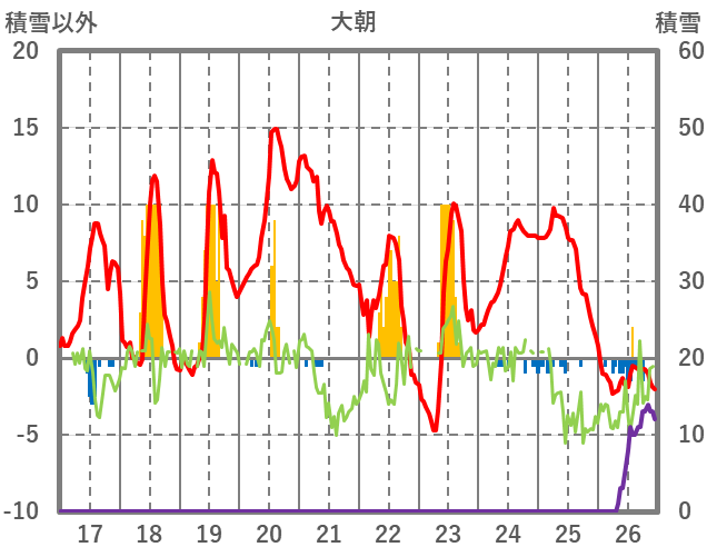 | 日 | 時 | 気温 | 降水 | 風向/風速 | 日照 | 積雪 | 降雪 |