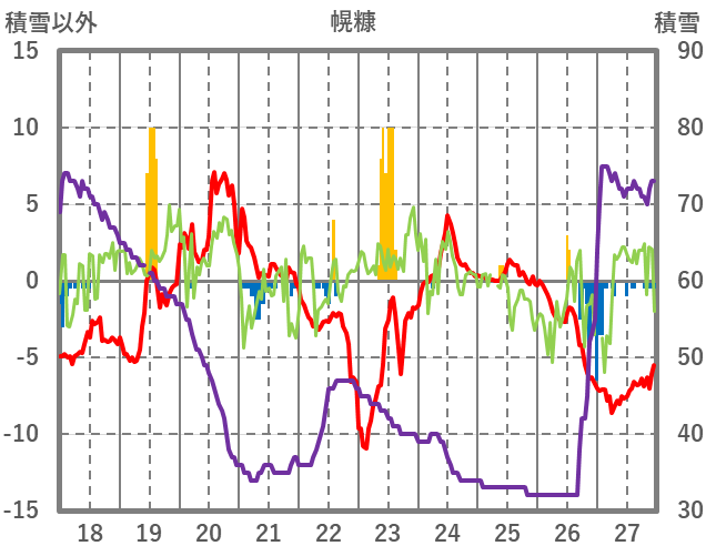 | 日 | 時 | 気温 | 降水 | 風向/風速 | 日照 | 積雪 | 降雪 |