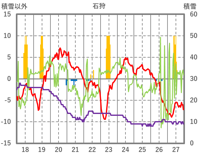 | 日 | 時 | 気温 | 降水 | 風向/風速 | 日照 | 積雪 | 降雪 |