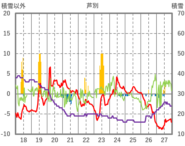 | 日 | 時 | 気温 | 降水 | 風向/風速 | 日照 | 積雪 | 降雪 |