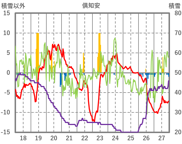 | 日 | 時 | 気温 | 降水 | 風向/風速 | 日照 | 積雪 | 降雪 |