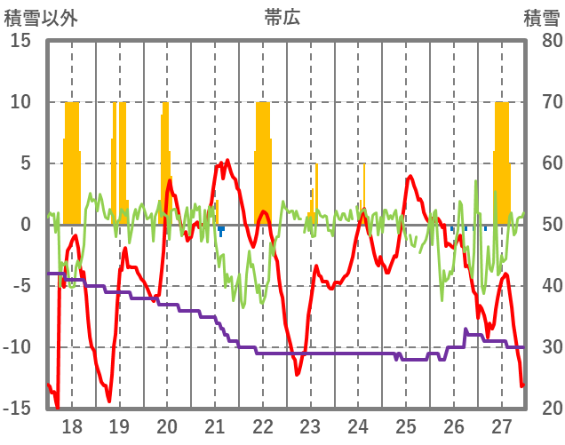 | 日 | 時 | 気温 | 降水 | 風向/風速 | 日照 | 積雪 | 降雪 |