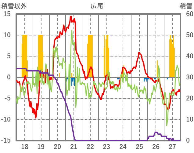 | 日 | 時 | 気温 | 降水 | 風向/風速 | 日照 | 積雪 | 降雪 |