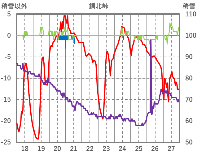 | 日 | 時 | 気温 | 降水 | 風向/風速 | 日照 | 積雪 | 降雪 |