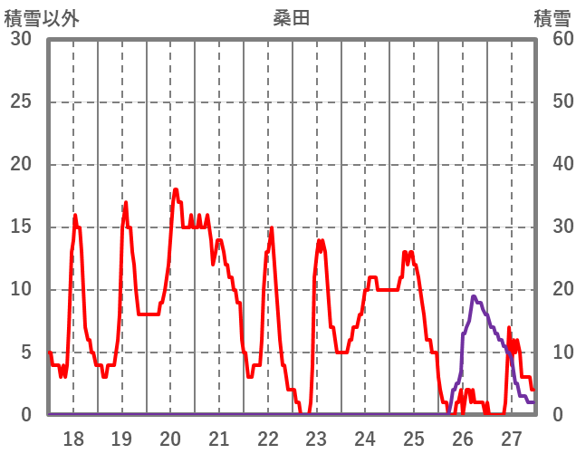 | 日 | 時 | 気温 | 降水 | 風向/風速 | 日照 | 積雪 | 降雪 |