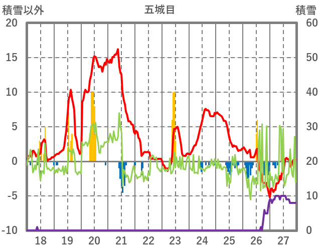 | 日 | 時 | 気温 | 降水 | 風向/風速 | 日照 | 積雪 | 降雪 |