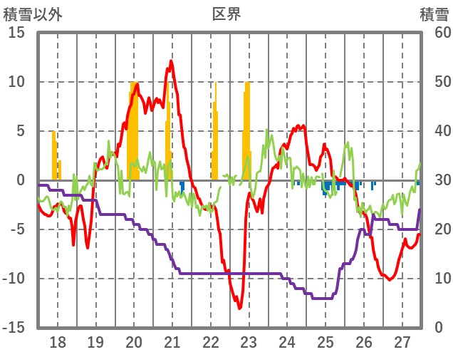 | 日 | 時 | 気温 | 降水 | 風向/風速 | 日照 | 積雪 | 降雪 |