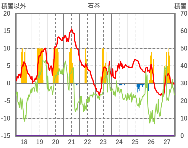| 日 | 時 | 気温 | 降水 | 風向/風速 | 日照 | 積雪 | 降雪 |