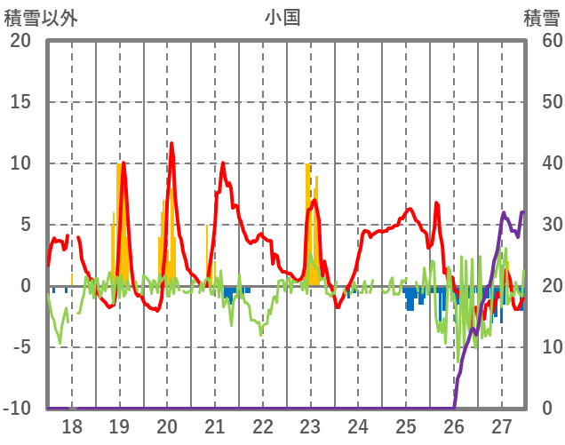 | 日 | 時 | 気温 | 降水 | 風向/風速 | 日照 | 積雪 | 降雪 |