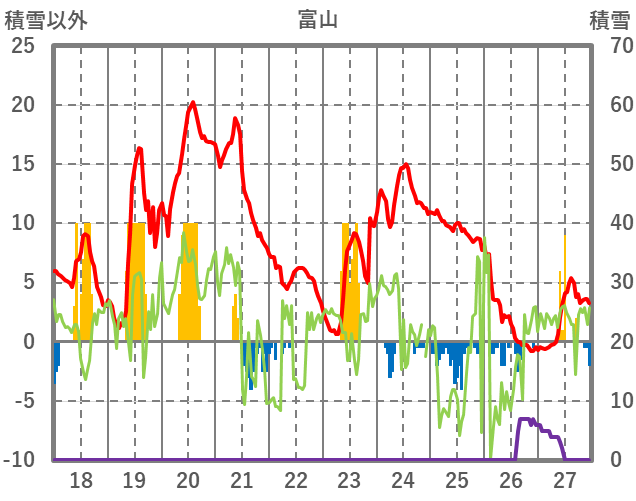 | 日 | 時 | 気温 | 降水 | 風向/風速 | 日照 | 積雪 | 降雪 |