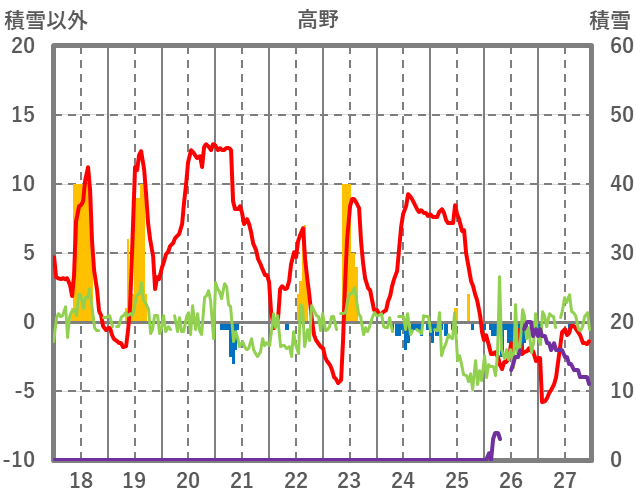 | 日 | 時 | 気温 | 降水 | 風向/風速 | 日照 | 積雪 | 降雪 |
