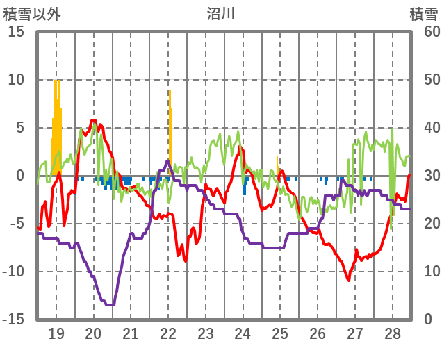 | 日 | 時 | 気温 | 降水 | 風向/風速 | 日照 | 積雪 | 降雪 |