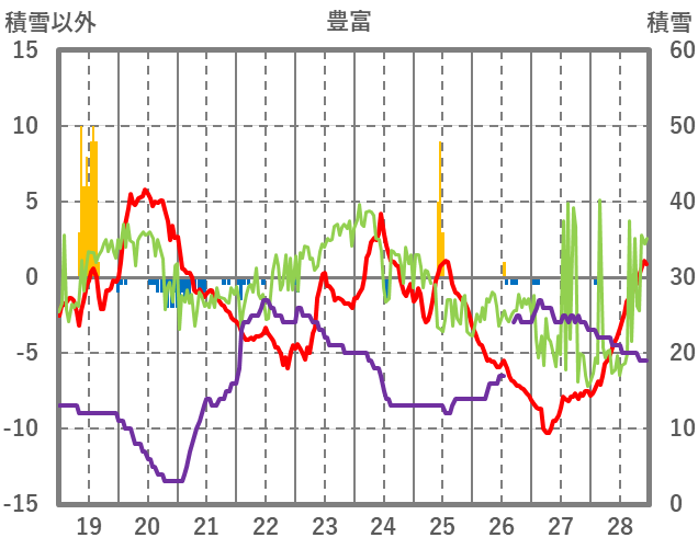 | 日 | 時 | 気温 | 降水 | 風向/風速 | 日照 | 積雪 | 降雪 |