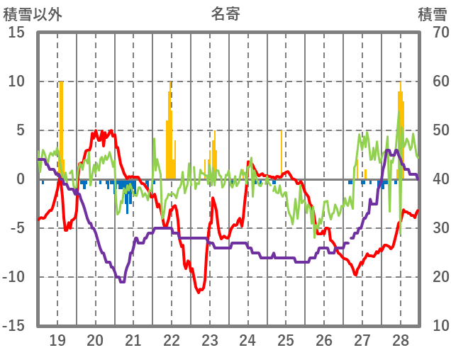 | 日 | 時 | 気温 | 降水 | 風向/風速 | 日照 | 積雪 | 降雪 |