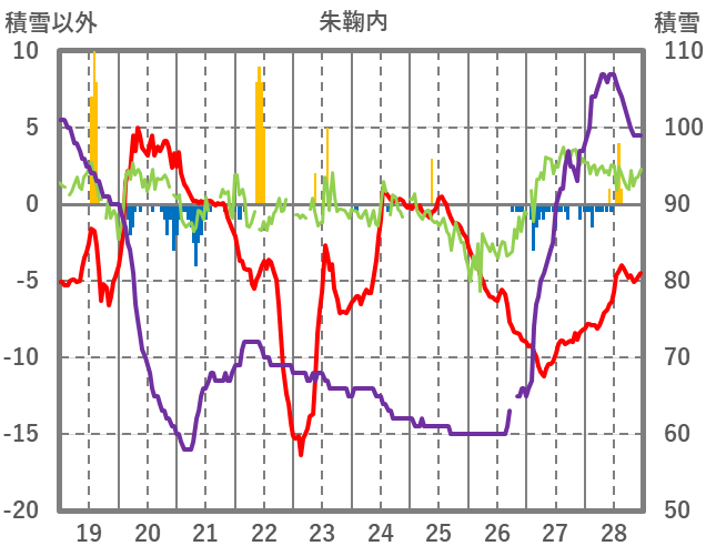 | 日 | 時 | 気温 | 降水 | 風向/風速 | 日照 | 積雪 | 降雪 |