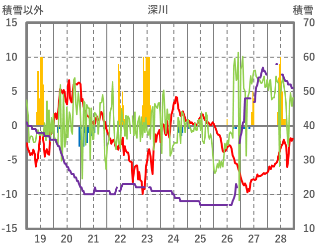 | 日 | 時 | 気温 | 降水 | 風向/風速 | 日照 | 積雪 | 降雪 |