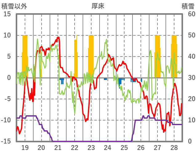 | 日 | 時 | 気温 | 降水 | 風向/風速 | 日照 | 積雪 | 降雪 |