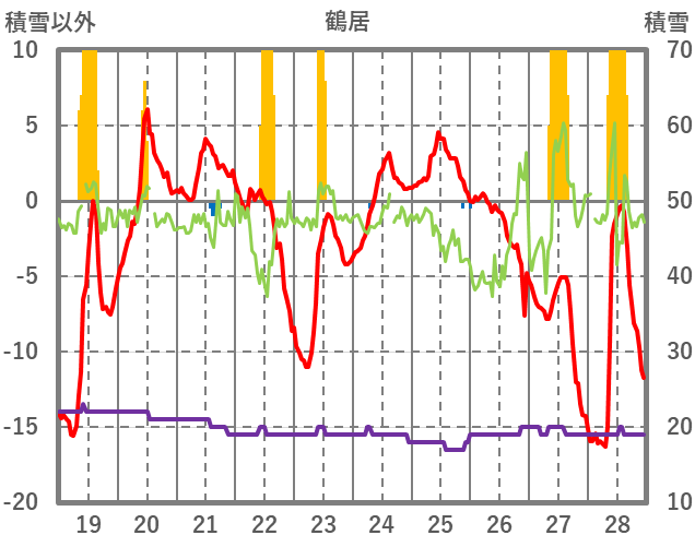 | 日 | 時 | 気温 | 降水 | 風向/風速 | 日照 | 積雪 | 降雪 |